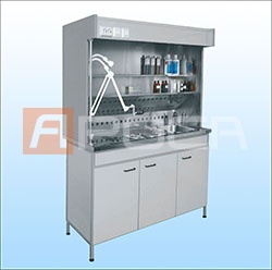 Раковина располагается справа о рабочей поверхности. Внутренняя рабочая поверхность станции из нержавеющей стали. Станция снабжена двумя контурами принудительно/пассивной вентиляции. 1-й контур позволяет эффективно отбирать испарения (формальдегид) непосредственно от зоны вырезки и рабочей поверхности стола во время работы, 2-й вентиляция всех полостей шкафа, в т.ч. и влажного архива в нижних отделах на постоянной основе. Рабочая поверхность состоит из двух перфорированных секций. Секции снимаются для обработки раковины и замены съемных фильтров. Станция имеет хорошее общее (лампа дневного света) и дополнительное точечное освещение, полки для инструментария и растворов, наличие весов (дополнительная спецификация), лупы на гибком держателе, возможность хранения влажного архива, кран для горячей и холодной воды с гибким шлангом и оборудование для канализации, а так же встроенную бактерицидную лампу.
